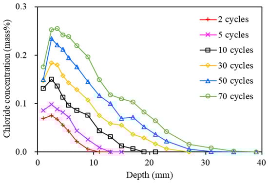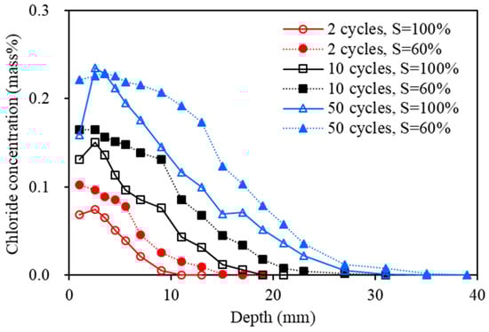 - Under drying–wetting conditions, a chloride peak presented in the skin layer of saturated specimens, while the peak was not obvious for unsaturated specimens. The specimens of lower saturated levels exhibited a higher chloride transport at early exposure to drying–wetting cycles. The effect of the initial saturation level on chloride transport became less pronounced as the exposure continuously proceeded.