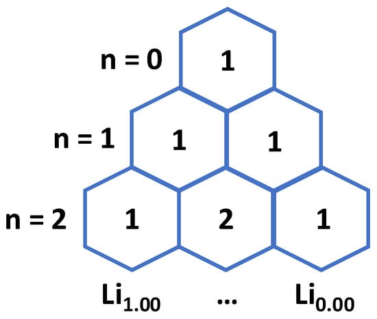 The total number of delithiated structures across Lix is related to Pascal’s triangle where each row increases the total number of Li at Li1.00 by one. Sums of the row equal the total number of configurations in the charge cycle.