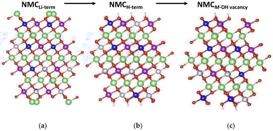 The exposure of NMC to water and subsequent metal release followed the pathway depicted in Figure 2. When cleaved from the bulk, NMC is Li terminated, as shown in Figure 2a, and labeled as NMCLi-term. Upon exposure to water, Li is much more favorable as a Li+ cation, resulting in exchange of Li/H on the surface []. This results in a hydroxylated termination, as confirmed using ab initio thermodynamics of the isostructural LCO surface and extrapolated to NMC, as shown in Figure 2b, and labeled as NMCH-term []. Figure 2b,c depicts the release of an M−OH unit (from each side of the symmetric slab), which was found to be the preferred leaving group from the cathode surface in previous computational studies [,,,,,]. The resulting slab with the M−OH vacancy was labeled as NMCM-OH vacancy.