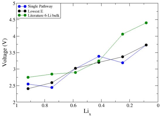 We first considered a small bulk structure with 6 Li atoms. A total of 6 Li atoms resulted in 64 total configurations that could be modeled and could calculate the intercalation voltage in 2 ways: (1) a single pathway where Li is removed from the previously delithiated structure or (2) sample all the configurations to find the lowest energy arrangement at each value of Lix. Shown in Figure 3 are the voltage curves for the 6 Li atom bulk structure using the 2 approaches, including the results of a published computational study using a 6 lithium atom structure for comparison []. Approach 1 involved removing an individual Li atom and using that vacancy structure to generate the next Li vacancy in a stepwise fashion. As shown in Figure 3, this leads to non-monotonic changes in the voltage curve. Ideally, we wanted to reproduce cyclic voltammetry measurements, which show monotonic increases in potential as the materials are oxidized [,,,], leading us into the results of approach 2. For approach 2, only the lowest energy configuration at each lithium fraction was used, which yields a monotonic voltage curve. Knowing this, to approach the 18-lithium atom supercell surface model, we needed to optimize a range of configurations at each lithium fraction to find the lowest energy configurations. To generate these delithiated structures, a python code was used to generate a list of all possible ways to remove Li atoms from the fully lithiated surface. At each lithium fraction, 30 configurations were randomly selected and optimized. By comparing similarities in the most energetically favorable structures, we sought to provide a further insight into how to better select delithiated structures a priori to reduce the number of configurations required for the adequate sampling of these larger sized systems across the charge cycle.