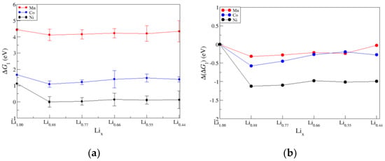 ΔG1 values (eV, Equation (2)) for M = Ni, Mn, or Co. The values of the standard deviation, σ (eV), for all configurations are also reported.