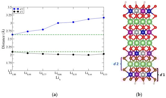 (a) O–M–O (d1) and O–Li–O layer spacings (d2) tracked across the charge cycle. (b) Layered NMC structural model indicating O–M–O layer in black and O–Li–O layer in blue.
