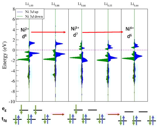 Projected densities of states of surface Ni d-states as a function of Lix with down-spin density in green and up-spin in blue. EF is set to zero, indicated by the dashed purple line. Electron field splits are provided below to show the changes in Ni oxidation state.