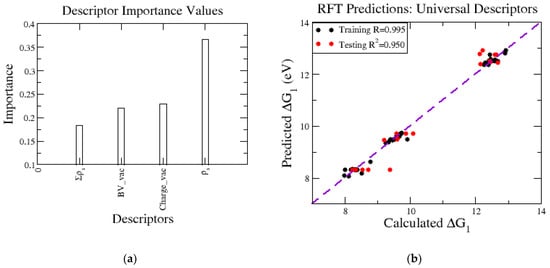 While the above analyses show that trends in ΔG1 can be interpreted in terms of slab geometry (d) and electronic structure (PDOS, oxidation state), it is the case that the level of system complexity hinders efforts to delineate the principal factors governing metal release. To this end, we employed RFT machine learning to build a model for ΔG1 based on descriptors. The initial descriptor testing is shown in the Supplementary Materials (Figure S2), which led to the selection of the four descriptors that are transferable when extending to other systems beyond Lix in NMC. The RFT model is built using two descriptors to track changes in the oxidation state, both derived from the starting (defect-free) slab. First, we used empirical bond-valence sums, referred to as BV, which are determined using the DFT optimized geometries and bond-valence parameters from the literature []. Briefly, in bond-valence theory, each bond between pairs of atoms contributes to BV. Bond-valence models are constructed such that the value of BV for a given atom should equal the magnitude nominal charge. Thus, in pristine NMC with Lix = 1.00, the values of BV would be 2, 3, and 4 for Ni, Co, and Mn, respectively. We denoted the value of BV for the metal atom to be removed as BV_vac. The second descriptor based on the starting slab was the calculated number of the valence electrons on the metal, (Charge_vac), which was readily obtained from the DFT output file for the optimized geometry. As mentioned in the Introduction, reviewing the metal release studies in other CMOs, another feature we linked to ΔG1 relates to the spin pairing and the vacancy-induced disruptions to it throughout the lattice. This is included in two descriptors, one being the magnetic moment of the metal to be released, (ρs) and the other is the sum of the magnetic moments of the neighboring metal atoms, (Σρs). The RFT model can assign the importance of each descriptor when predicting ΔG1, shown in Figure 7a. We observed the magnetic moment of the vacancy is the most important in the case of delithiated NMC vacancies and obtained accurate predictions, shown by a testing R2 value of 0.95 (Figure 7b). It is worth noting that remaining in the phase space of Ni1/3Mn1/3Co1/3 limits the range of ΔG1 values, shown by the tight groupings on the Ni, Mn, and Co release values, with Ni being the most favorable to release and Mn the least. This is a good starting point for descriptor selection and should be expanded to more complicated datasets with varied compositions and formulations of CMOs to obtain a large span of ΔG1 values filling in the gaps seen in Figure 7b and include additional metals other than Ni, Mn, and Co to have a predictability beyond NMC.