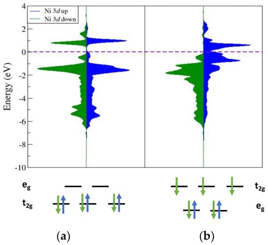 Using Equation (1), the lithium intercalation voltage, V, was calculated using the DFT total energy information for the NMC slabs as a function of Lix. As mentioned earlier, delithiating NMC beyond Li0.44 leads to lattice instabilities in the experiment. In exploratory calculations, the modeling of Lix structures in this range showed Ni displacement where Ni falls into the tetrahedral site of the lithium channel. These occurrences cause large changes in the DFT energy and non-sensical voltage predictions. This displacement of nickel is indicative of the known preference for a structural transformation of the delafossite structure into the spinel structure, causing the voltage prediction to fail. The changes in coordination environment of these Ni atoms can be tracked through calculated changes in their electronic structure using PDOS analysis. Figure 8 shows this comparison of two Ni atoms from the same structure at Lix = 0.22. The first is when Ni is in the octahedral site (Figure 8a) expected for the delafossite structure and when Ni occupies a tetrahedral site (Figure 8b). At a low value of Lix, the charge balance and redox potentials suggest that all lattice Ni will be present in the 4+ oxidation state. The octahedral PDOS shows a close match between the spin-up and spin-down spin density above and below EF, indicating a d6 configuration where there would be three up and spin-down electron in the t2g orbitals of an octahedral field split. The tetrahedral site nickel shows a distinctly different electronic structure, reflecting that the coordination environment changed. All the spin-down densities are below EF, while the spin-up densities are shifted above EF, indicating a d7 configuration in which all spin-down electrons fill the tetrahedral field split and the eg is also filled with spin-up electrons. When Ni relaxes into the tetrahedral site, as seen in sufficiently low Lix structures, there is a change in oxidation state, where it is now a Ni3+ cation that is more stable in a tetrahedral environment than a Ni4+ cation.