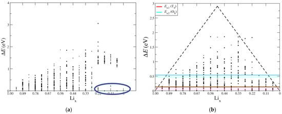We next examined the range of DFT total energy values, ΔE, for different configurations of a given Lix. The goal was to identify trends in the lowest energy configurations to guide and constrain future modeling. Depicted in Figure 9 are the calculated values of ΔE as a function of Lix, where the total energy of the lowest energy configuration at each Li fraction was set to zero. On the left-hand side, the structures that have nickel atom displacements were included, and on the right-hand side, the baseline structure was set to the lowest energy structure, where nickel remains in the transition metal layer. The range of ΔE values is smallest at the endpoints corresponding to Li1.00 and Li0.00 and similar to the pascal triangle example in Figure 1, depicted in Figure 9b by the dashed black line. As Lix increases towards the intermediate lithium fractions, the total number of possible configurations increases, accompanied by larger values of ΔE. The two horizontal lines at 0.136 eV and 0.544 eV represent the energy barriers for different lithium diffusion pathways for the tetrahedral site (Ea,1, red) and octahedral site mechanism (Ea,2, cyan), respectively. Figure 9a shows the configurations that transition to the spinel phase and cause energy shifts that make the configurational energies unrelatable through the lithium diffusion pathway (circled in blue). In the case of the right-hand side, there are many low energy structures below the lithium diffusion barriers, which give a sensible voltage curve with a limited number of optimized structures. Overall, the analysis of ΔE and comparison to diffusion barriers further justifies the static calculations from Lix = 1.00 down to 0.44. This further explains why the calculations for V can become non-monatomic and unreliable for some Lix configurations lower than 0.44.