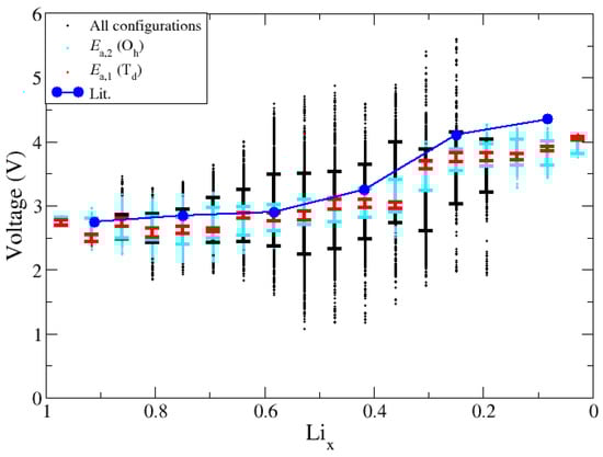 The study of ΔE as a function of Lix provides guidance in the calculation and interpretation of V. We calculated the values of V based on Equation (1) and using all possible combinations between two neighboring lithium fractions, and then we refined the dataset based on the outcomes of the above analyses. Figure 10 shows the voltage curve for all datasets, including the full (“all configs.,” black), configuration energies below Ea,2 (cyan), configuration energies Ea,1 (red) and another computational voltage curve of a small bulk system for comparison (blue). As shown in Figure 10, σ in V is the smallest for configurations that are below Ea,1. Because these structures exhibit a relatively small value of ΔE, they will yield similar V values when compared to neighboring Lix. For structures that fall outside either of the Ea, neighboring structures are no longer related by the energy of Li diffusion, thus produce a voltage value outside of the expected voltage range and can produce non monotonic changes in voltage. In summary, the non-monatomic changes in V can be traced to instances where the changes in Lix induce structural deformations in the slab, in which case Equation (1) is not applicable as it is meant to represent the differential limit of small changes in Lix.