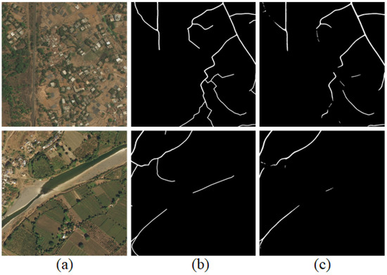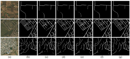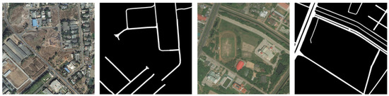 A public road extraction dataset DeepGlobe [27] is applied for evaluating the performance of the proposed method. The dataset provides images with a pixel size of 1024 × 1024 and a pixel resolution of 50 cm/pixel which includes multiple scenes such as cities, villages, wild suburbs, seashores, tropical rainforests, etc. The dataset contains 6226 images and corresponding annotated ground truth labels. In this paper, we divide it into 4696 images for training and 1530 for testing following [4]. Some samples are shown in Figure 1.