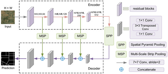 Overall architecture of the proposed multi-scale strip pooling network (MSPNet). The encoder module contains four residual blocks, the MSP module is applied to extracting linear features of the roads, and the PPM module is used to learn complex features from different scales. The decoder module is applied for gradually upsampling the resolution of the output feature map to get the final per-pixel prediction.