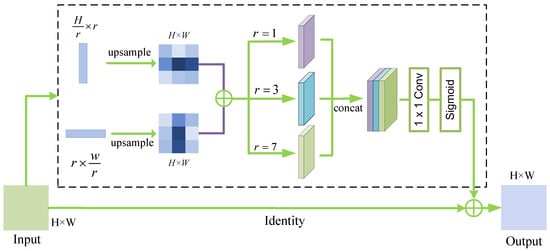 Let denote the input tensor for the MSP module, where H, W represent the height and width. In the MSP module, X is first fed into two pathways along either the horizontal or vertical spatial dimension, each of which contains a strip pooling layer with long but narrow kernel shapes of or to extract linear features of roads, where r is the scaling factor for adjusting the kernel sizes. Let and be the output feature maps extracted by the two strip pooling layers along the horizontal or vertical direction. Then, we upsample the two feature maps to the same size of input tensor by using a bilinear upsampling layer. Afterwards, we combine the two feature maps of and to obtain , which can be formulated as: