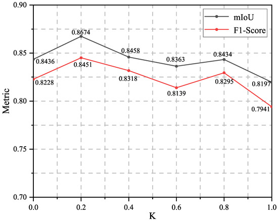 The experiment results with different configurations of hyper-parameter K are shown in Figure 6. It can be seen that the F1-score and MIoU are fluctuating as K increases. When , it achieves a best MIoU score of 86.74% and F1-score of 84.51%. It is noted that the performance is reduced to 82.28% in terms of F1-score with and 79.41% with ; the comparison results show that the separate use of BCE () or dice () loss function cannot obtain the optimal results for road extraction. As listed in Table 2, the performance with is also better than the simple combination of “BCE + Dice”, which obtains improvements of 1.48% on the MIoU score and 0.75% on the F1-score.