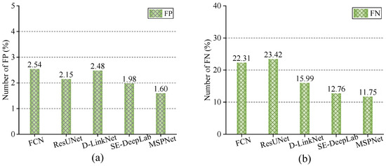 The partially visualized segmentation results of our MSPNet and other methods are illustrated in Figure 8, which shows three examples from different scenes. The corresponding distributions of FP and FN are plotted in Figure 9. The results extracted by FCN are worse than those of other methods, which is mainly caused by the loss of spatial information after multiple downsampling operations in its early layers. The results of UNet and D-LinkNet are similar, and they also both contain many missing connections and FP pixels. The SE-Deeplab shows better road connectivity compared with other methods, and it obtains the second-best results. In comparison, our proposed method extracts roads with better connectivity and smoother road edges. The roads segmented by other methods may be interrupted especially in some regions where occlusions exist, while our MSPNet recovers the connectivity very well by effectively capturing long-range dependencies along road regions. For example, in the results of rural areas (the first row in Figure 8), there are several residential houses in the upper-right and lower-left corner of the image, which are planted many trees on both sides; the results extracted by other methods contain some broken road segments and fail to maintain the connectivity, but the result extracted by MSPNet is consistent with the ground truth. In addition, in the results of densely connected road areas (the second and third row in Figure 8), other methods recognize some branch roads as background, while the proposed methods are consistent with those of ground truth, and very few FP pixels exist. These visualized segmentation results verify the superiority of our MSPNet in the task of road extraction from remote sensing images.