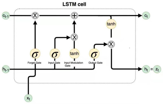 The structure of the LSTM neural network is shown in Figure 1. Supposing that the network input is and the hidden-layer state is , at time t, the calculations of each unit and gate are shown in Equations (3)–(8):