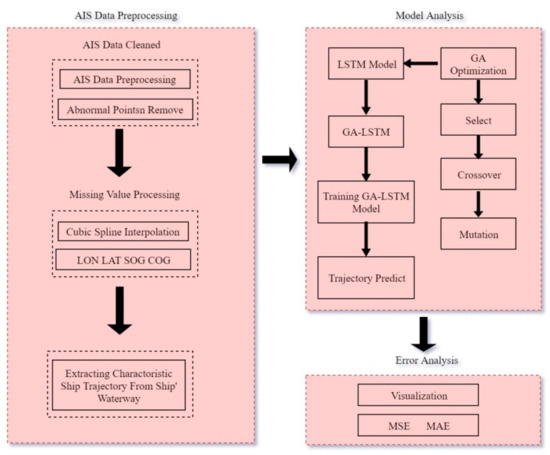 The ship trajectory prediction model framework is shown in Figure 2. The framework is mainly composed of three parts: data preprocessing, model analysis, and error analysis. Data preprocessing is an essential part of GA-LSTM model, and the data after preprocessing can improve the overall performance of the model to a certain extent. For model analysis, the GA is introduced into the selection of network hyperparameters based on the LSTM network model, which reduces the influence of artificial determination to some extent. For error analysis, visualization and index evaluation are used to further verify the feasibility and performance of the proposed method.