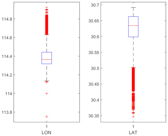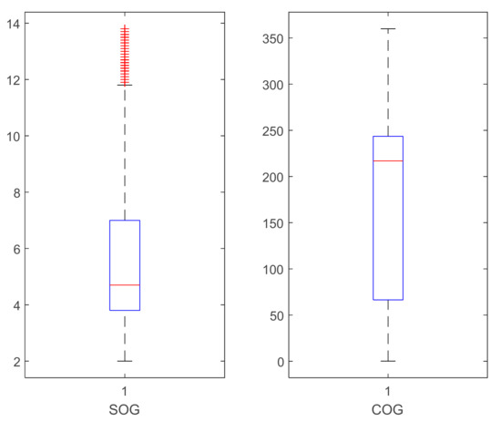 - In this paper, the LAT range of the track point is set to [110.00, 115.00], the LON range is set to [30.00, 32.00], the SOG range is set to [2.0–14.0], the SOG range is set to [0–360], and the distribution of research data after AIS data cleaning is shown in Figure 3 and Figure 4.