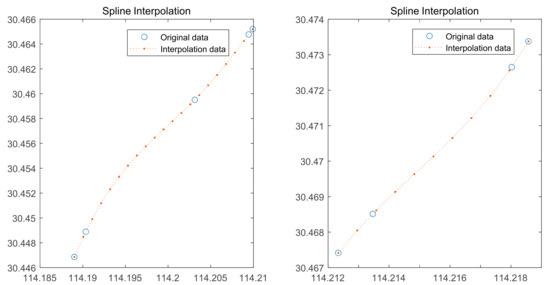 In the experimental data in this paper, there are some missing AIS data for individual ships. As for the problem of missing values for ship LON and LAT, the method of cubic spline interpolation [34] is used to complete the model, as shown in Figure 5 for the interpolation results of completing missing values of LON and LAT data in two AIS data values. For the missing of SOG and COG during this period, considering the relatively constant characteristics of ship SOG and COG in a short period of time, the average value is used for interpolation.