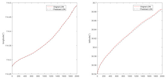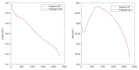 The collected AIS data of ships are divided into training and test sets according to the above method. Figure 7 shows the LON and LAT of the ship predicted by the GA-LSTM model proposed in this paper. It can be seen that the LON and LAT predicted by this model are basically consistent with the actual LON and LAT of ship-1, which can accurately predict the position of ships in inland rivers.