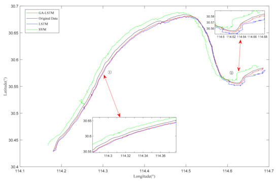 After data preprocessing, a series of typical ship trajectories with large turning amplitudes is selected for experiments. In this paper, considering model calculation complexity, calculation time, and prediction performance for the SVM model, the radial basis function is selected as the kernel function, where the values of kernel function parameter and penalty coefficient are and , respectively. For the LSTM network model, 30 hidden-layer neurons are selected, the number of iterations is 1000, and the learning rate is 0.01. The parameter values for the GA [35,36] are shown in Table 1, where MaxGenerations is the maximum number of iterations before the GA stops optimization and PopulationSize is the size of the initial population. The smaller its value is, the more prone sick populations are to appear. The larger the population size is, the more difficult the algorithm is to converge and the lower robustness it has. CrossoverPop is the crossover probability; if the value is too large, it is easy to miss the optimal individual and the randomness is large, while the crossover probability is too small to effectively update the population. MutationPop is the mutation probability; if its value is too small, the diversity of population decreases too quickly, which easily leads to the loss of effective solutions and is hard to repair. If its value is too large, the probability of the optimal individual being destroyed also increases, which is not conducive to finding the optimal solution.