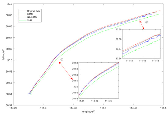 The AIS data of ship-2 are also used to predict the LON and LAT of the trajectory by the GA-LSTM model. The experimental results are shown in Figure 9. It can be seen from Figure 9 that the LON and LAT of ship-2 predicted by GA-LSTM are basically the same as the LON and LAT of the actual position in the position prediction of ship-2. Similarly, the trajectory was predicted by the SVM and LSTM models, and the experimental results are shown in Figure 10. It can be seen that the method proposed in this paper has higher prediction performance and better effect, and it can effectively predict the navigation position of ship-2, which further proves the effectiveness and feasibility of the method proposed in this paper.