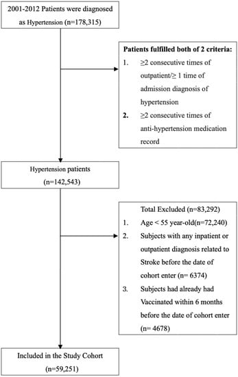 This nationwide population-based case–control study used data from patients diagnosed with hypertension from 2001 to 2012 in Taiwan with all diagnoses corresponding to the codes of the International Classification of Diseases, Ninth Revision, Clinical Modification (ICD-9-CM). The positive predictive rate of hypertension diagnosis in NHIRD had been validated before [24]. We obtained the data from Taiwan’s Longitudinal Health Insurance Database (n = 1,000,000) and selected all patients diagnosed with hypertension (n = 178,315) from January 2001 to December 2012. Those excluded from the initial selection were individuals without a subsequent outpatient or inpatient diagnosis of hypertension or subsequent prescription of any antihypertensives (n = 35,772), individuals younger than 55 years old (n = 72,240), individuals with diagnosis related to stroke before the index date (n = 6374) and individuals already vaccinated within the 6 months prior to index date (n = 4678) (Figure 1).