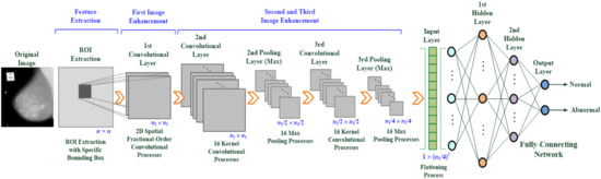 Accordingly, in recent years, artificial intelligence (AI) methods and the collection of data for big data (BD) are playing increasingly important roles for automatic tumor screening, such as liver, lung, and breast cancers. AI methods include models based on machine learning, deep learning, and broad learning [2,3,4,5,6,7,8,9]. For example, in Taiwan, data collection for BD includes medical images of relevant major diseases that major medical centers have been actively collecting both locally and abroad in recent years (since 2018). These medical images comprise fifteen categories, including X-ray images, angiography, magnetic resonance imaging (MRI), and computer tomography (CT). Additionally, a database such as CBIS-DDSM (Curated Breast Imaging Subset of Digital Database for Screening Mammography), is a database containing approximately 2500 enrolled subjects, employed for the studies of the mammographic classification of breast lesions. This classification consists of normal cases, benign cases, malignant cases, and pathology information [10], which provides ground truth validation that makes the DDSM applicable in the development and validation of the decision support systems. The region of interest (ROI) and pathological information can be gathered continuously in the current database. Coupled with the improvement of information communication, digital data processing, AI methods, and machine vision models, software and hardware equipment can process the large amount of digital data [11,12,13]. However, a decision support system with computer-aided diagnosis and detection algorithms for breast tumor screening in mammography are needed. Currently, regarding AI algorithms, the multilayer machine vision recognition model that is composed of convolutional neural networks (CNNs) is the most commonly used model. It can be used for digital image processing, such as feature enhancement, feature extraction, data simplification, and pattern recognition task [2,3,4,5,6,7,8,9,13,14,15]. Hence, this study uses breast mammogram images to establish a two-dimensional (2D) fractional order-based CNN classifier that can automatically perform breast tumor screening tasks in clinical applications. We expect that a set of automatic screening tools suitable for clinical usage that takes in mammogram images can be developed to achieve the rapid identification of whether a tumor is malignant or benign. When any breast tumor is suspected, the results of the rapid screening can be used as a basis of reference for subsequent fine needle aspiration cytology/biopsy examinations. Hence, this assistive tool solves the problem of insufficient human resources for manual screening, which can potentially lead to additional problems in the medical diagnosis process. Solving this procedural congestion allows clinicians to focus more on follow-up medical strategies.