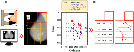 ROI extraction: In this study, we use digital data in the mammogram X-ray image database (161 female patients, 322 images) [33,34] provided by the MIAS. The biomarkers of MIAS database clearly mark the positions and tumor sizes [33]. The statistical results of probability distribution of tumor locations, in accordance with the MIAS database’s biomarkers, are shown in Figure 2a. Looking at the distribution probability of tumor locations, the most frequent location of tumors is the right and the upper outer quadrant of the breast. Given a 2D image with 4320 pixels × 2600 pixels, we define the priority for automatically extracting ROI with a specific bounding box based on the distribution probability. Areas with greater probability are first in line for ROI extraction, and the priority order is stored in the work queue. The priority order is shown in Figure 2b. ROI image extraction and tumor detection is performed as per the priority order.