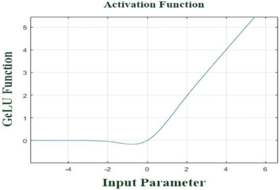 In two hidden layers, the Gaussian error linear unit (GeLU) function [40,41,42] is used as the activation function in each hidden node. This activation function performs a nonlinear conversion, as shown in Figure 3, which can be expressed as follows: