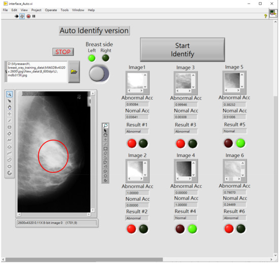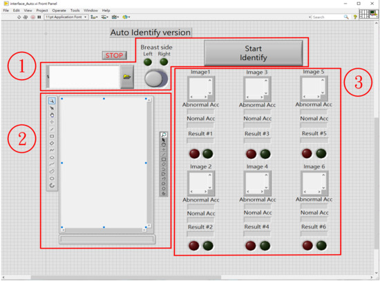 This study uses the LabVIEW 2019 (NITM) software to develop a computer assistive system for automatic breast tumor screening, integrating: (1) ROI image extraction, (2) feature enhancement and extraction, and (3) breast tumor screening classifier and other functions. Algorithms for functions (1) and (2) are developed using the MATLAB Script tool. The multilayer CNN algorithm and the interface shown in Figure 4 are written by Python software. The interface works as follows: