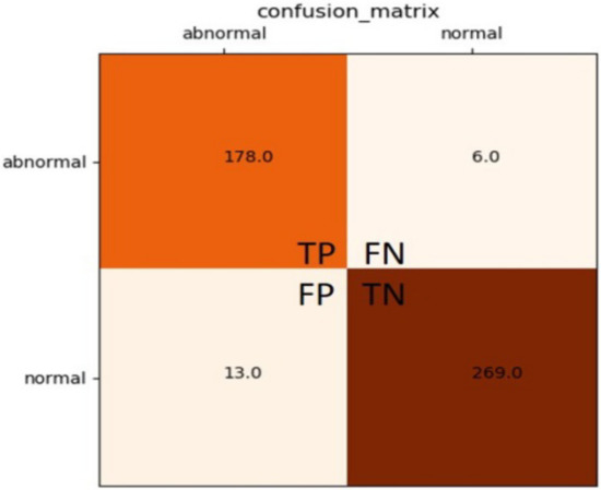 In the MIAS database, the most common image size was 4320 pixels × 2600 pixels. Thus, in this study, the dimensions 4320 pixels × 2600 pixels were selected for breast tumor screening [33,34]. The vertical and horizontal resolutions of each image were identical at 600 dpi, with a bit depth of 24 bits. A total of 156 mammography images (78 subjects), including 62 images with malignant (M) or benign (B) tumors and 94 images without tumors, were obtained. Given a specific bounding box measuring 100 pixels × 100 pixels, feature patterns were screenshots from the 156 images. In total, 932 feature patterns, including 564 tumors and 368 tumor-free screenshots, were obtained. In each classifier’s training stage, 282 tumor and 184 tumor-free screenshots (50% feature patterns) were randomly selected to train the multilayer CNN classifier. The remaining 50% of the feature patterns were used to evaluate the classifier’s performance for each cross-validation. This study used the relevant data, as shown in Table 1, to establish a multilayer CNN-based classifier. We designed a fractional-order convolutional layer, two general convolutional layers, and two MP processing layers for feature enhancement and extraction. The convolutional layer had 16 kernel convolutional windows. In the kernel window, the sliding window moved the number of columns and rows in steps of 1 (stride = 1) at each point of the convolution operation. The padding parameter was set to 1 to maintain the feature pattern after the convolutional operation. During the pooling process, the MP window moved with a stride of 2 (stride = 2) each time. During each feature enhancement, and extraction process, the possible tumor features and contours were gradually enhanced by the convolutional-pooling processes; hence, it can be observed that the multilayer CNN-based classifier can improve the accuracy of pattern recognition based on these enhanced features. Tenfold cross-validation was performed using precision (%), recall (%), F1 score, and accuracy (%) as indicators [35,36,48] to evaluate the prediction performance of the proposed classifier. Figure 5 shows the visualization of the confusion matrix; for example, the classifier used 466 images for rapid screening, and the results show 178 TPs, 13 FPs, 269 TNs, and 6 FNs. The precision (%), recall (%), F1 score, and accuracy (%) can be calculated from the confusion matrix.