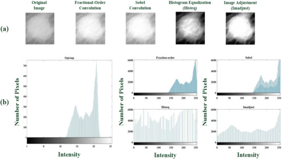As seen in Table 5, three types of convolution windows in the first convolutional layer, including fractional-order windows, Sobel windows, and Histeq windows, are used perform the 2D spatial convolutions [35,36,47,49,50,51,52]. Figure 6a shows the original image and image enhancement results of these three types of convolution windows. Figure 6b shows the pixel grayscale value distribution map after the image is magnified. Compared with the original image grayscale value (0–255) distribution map, the convolution result of the first derivative-based Sobel convolution window [49] has a smoothing effect and is anti-noise but requires a considerable amount of calculations while performing convolutions; moreover, this window type produces a thicker edge contour, which results in lower accuracy in identifying the position of the target object. We can use a second-order-based convolutional window for feature enhancement, but this window is fairly susceptible to noise and thus unsuitable for obtaining the edge contour of the target; this type of window is generally used for binarization applications. The Histeq convolution (histogram regularization) [50] yields a histogram of the number of times each grayscale value appears. This histogram can describe the statistical information of the grayscale values of the image and allows the direct observation of the characteristics of the image, such as its brightness and contrast. It is primarily used for image segmentation and adjustment of grayscale values in the image. As shown in Figure 6b, the non-zero value of the histogram has a wide and uniform distribution, which indicates that the contrast of the image is high. The pixel value of the image may be readjusted to a value between 0 and 255 by using linear, piecewise linear, and nonlinear transformation functions [53]. These transformation functions are primarily used to magnify the contrast of the original image. The overall grayscale value distribution map shifts to the right, and the contrast of the image increases, thereby minimizing the effort required to highlight the outline of the malignant tumor, as shown in Figure 6a. However, this method is susceptible to factors such as illumination, viewing angle, and noise. The Histeq (histogram normalization) function [50] can automatically determine the grayscale transformation function and yield an output image with a uniform histogram. It is primarily used for contrast adjustments over a small range but could amplify background noise.