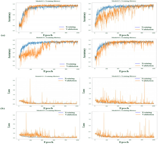 This study uses Model #1, as shown in Table 5, which adopts three convolutional layers, and the same completely connected classification layer to develop four models, as shown in Table 6. The convolutional window sizes of the second and third layers are combinations of (3 × 3, 3 × 3), (3 × 3, 5 × 5), (5 × 5, 3 × 3), and (5 × 5, 5 × 5) [51]. The image dataset is divided into two groups of equal size. The four models use 466 trained and 466 untrained feature patterns to test and confirm the performance of the classifier. A total of 1000 epochs are set for the training classifier, with the trained and untrained feature patterns. Figure 7 shows (a) the training performance of the classifier and (b) the training history curve of the classification performance validation; in (b), the solid blue line represents the results of the training performance test and the solid orange line indicates the results of classification performance validation. As the number of epoch training increases, the classifier’s output accuracy (%) gradually increases. The four classifier models require an average of lower than 240 s (lower than 4 min) CPU time to complete the training and testing tasks, as seen in Table 6. Then, the trained and untrained feature patterns are randomly selected, and the accuracy (%) of the four classifier models is tested by performing 10-fold cross-validation (Kf = 10). Table 7 shows the overall cross-validation results. Figure 7a indicates that the accuracy (%) of Models #2 and #3 can be improved over 600 epochs of training. By comparison, the accuracy of Models #1 and #4 can be improved over 200–400 epochs, after which it converges, and the accuracy (%) of classification approaches the maximum. The training convergence curve of the classifier is shown in Figure 7b. The accuracy (%) of the four models may reach larger than 95%. To shorten the classifier’s design cycle and reduce the memory requirements for storing classifier parameters, we recommend using the architectures of Models #1 and #4 to establish and implement the multilayer CNN-based classifiers.
