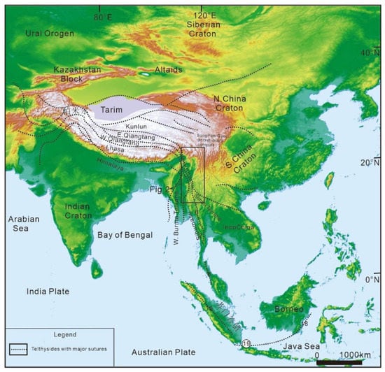 Geological map showing the tectonic framework of the Sanjiang Tethyan Orogen and its adjacent areas. Adapted with permission from Ref. [17]. Copyright 2016 ELSEVIER.