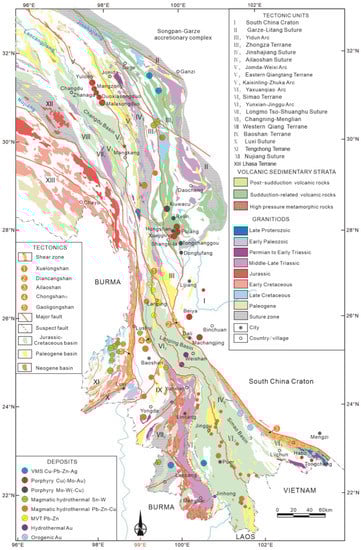- Hou, Z.Q.; Zaw, K.; Pan, G.T.; Xu, Q.; Hu, Y.; Li, X. Sanjiang Tethyan metallogenesis in S.W. China: Tectonic setting, metallogenic epochs and deposit types. Ore Geol. Rev. 2007, 31, 48–87. [Google Scholar] [CrossRef]