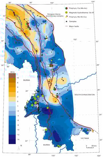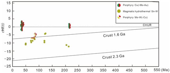 The zircon Hf isotope mapping of granitic rocks in the Sanjiang region reveals that the mineralization system in the Sanjiang region is controlled by the crustal properties in the region, and the differences in crustal properties constrain the distribution pattern of different mineralizing elements (Figure 3). The results of zircon Hf isotope mapping prove that the properties and composition of the crust are closely related to the formation and spatial distribution of polymetallic deposits. Firstly, all porphyry Cu-(Mo-Au) are located within the juvenile crustal blocks with high εHf values. This is consistent with the Cu-ore-forming magmas in the Jinshajiang-Ailaoshan suture mainly sourced from the juvenile lower crust [94]. Secondly, all magmatic-hydrothermal Sn-W deposits and porphyry Mo-W(-Cu) deposits are strictly controlled by the reworking of an ancient crust with negative εHf values and are mainly distributed in the Tengchong block, the Yidun island arc, and the Changning–Menglian suture (Figure 3 and Figure 4).