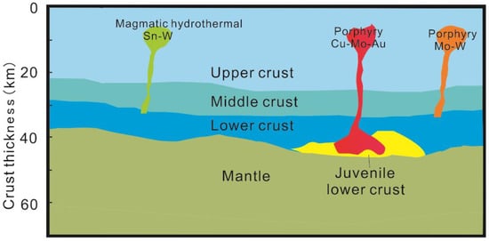 The Triassic porphyry Cu(-Mo-Au) deposits and Middle Eocene to Early Oligocene porphyry Cu(-Mo-Au) deposits are developed in a magmatic arc within the Garzê–Litang suture and the Jinshajiang–Laohuoshan suture zone, with a high εHf(t) region (Figure 3 and Figure 4). Ore-bearing porphyry magmas forming the juvenile lower crust in the Sanjiang Tethyan orogenic belt were derived from asthenospheric mantle wedge metasomatized by the upwelling of the asthenosphere in post-subduction and post-collision settings [17]. The underplating of these magmas at the bottom of the crust inevitably led to the enrichment of the juvenile lower crust in Cu(-Mo-Au) contents (Figure 5) [16]. These results suggest that the juvenile crust plays a major controlling role in the formation of porphyry Cu(-Mo-Au) deposits.