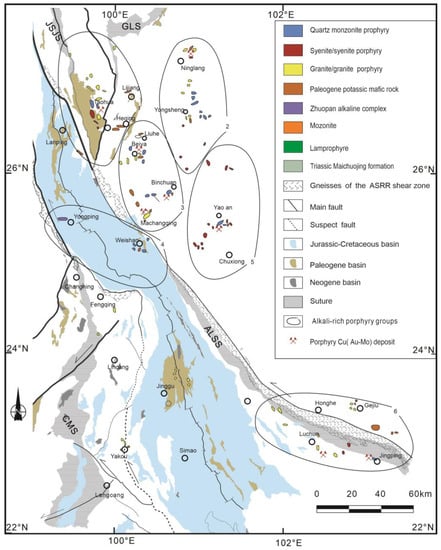 Cenozoic alkali-rich porphyry showing distribution in western Yunnan. Adapted with permission from Ref. [152]. Copyright 2020 Wiley Online Library.