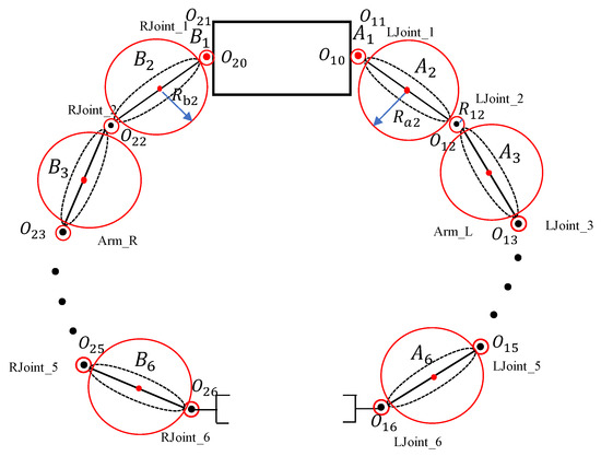 The base point of the main manipulator is denoted as , and the center points of the six joints are denoted as {,,,,,}. Then, the center points of the connecting rod are denoted as {,,,,,}. These values are determined by the parameters of the manipulator body. Taking the joint bounding sphere as an example, the joint bounding sphere can be expressed as: