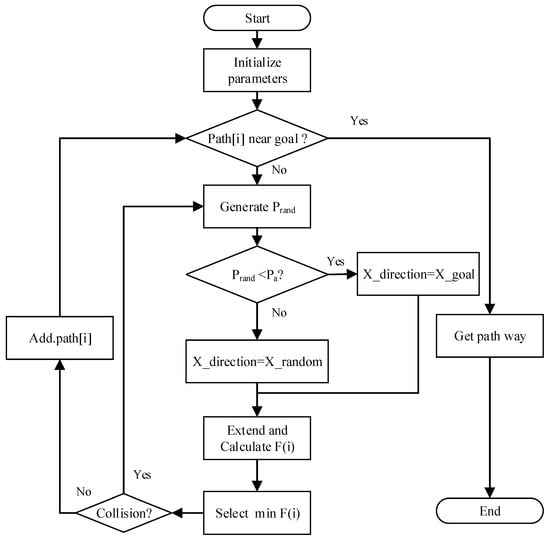 The overall flow of GA_RRT algorithm is shown in Figure 5. First, the main flow of the algorithm is used to perform random sampling. Then, the target point is expanded as a direction point with a probability of , and a random point is generated with a probability of 1 − for expansion. After randomly generating multiple random points for expansion, the algorithm calculates the A* cost function and selects the node with the smallest cost function for the next collision detection. If it passes the detection, the node is added to the random tree. Loop this process until you are near the target point.