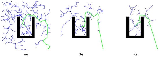 The obstacle avoidance path planning result of scenario B: (a) RRT; (b) G_RRT; (c) GA_RRT.