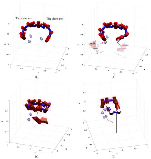 For static obstacles in the environment, as shown in Figure 13, the trajectory of the main arm is far away from the static obstacles. This can also be seen in Figure 14a. For the slave arm, the arm successfully avoids static obstacles, compared to Figure 8b. In addition, through the comparison of Figure 14a and Figure 8c, it can be seen that the slave arm realizes the static obstacle avoidance and completes the dynamic obstacle avoidance of the main arm.