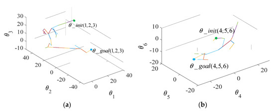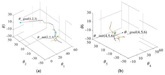Similarly, Figure 11 shows the path exploration process for the slave arm. The starting joint angle and target joint angle of the slave arm are 35, 30, 20, 0, 0, 0 and 0, −45, 30, −30, −15, 0, respectively. We can draw similar conclusions from the search results in Figure 12.