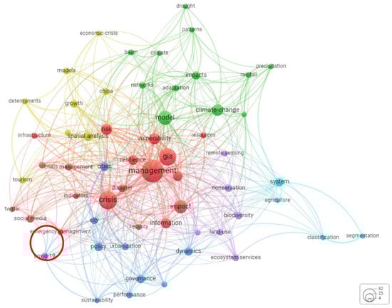 Weighted network visualisation of associations between terms within “crisis management spatial analysis” keyword relations (own study).