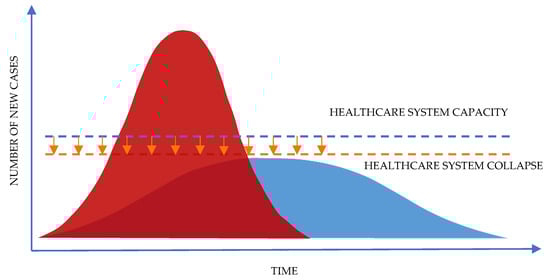 In the analysed publications on the subject of crisis management, the following problems are considered: the definition of risk, vulnerability, and hazard [80], the analysis of the existing crisis situation, and the management process [2,32,38,65,81,82,83]. The pivotal role of crisis management is to ensure public safety, in the matter of a pandemic, it is closely related to the capacity of the healthcare system [44,84,85,86]. Therefore, crisis management has to eliminate the possibility of an overload of the healthcare system, so that the number of new hospitalisations does not exceed the capacity of the healthcare system in a given area, as shown in Figure 2. Therefore, it is necessary to efficiently manage the available forces (medical staff, volunteers, services) and resources (infrastructure, equipment, equipment, and material reserves, restrictions, vaccinations) in time.
