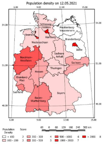 This simple set of criteria enables the implementation of the COVID-19 vulnerability risk assessment algorithm by all, even less advanced countries if needed. The research was based on several open data sources, such as web services that present demographic statistics: destatis.de [91] and the Robert Koch Institute Site [92], were used. Furthermore, to estimate the information on the transport network, selected data from OpenStreetMap were acquired and analysed. [93]. The case study area was limited to Germany, and the analyses were divided by regions.