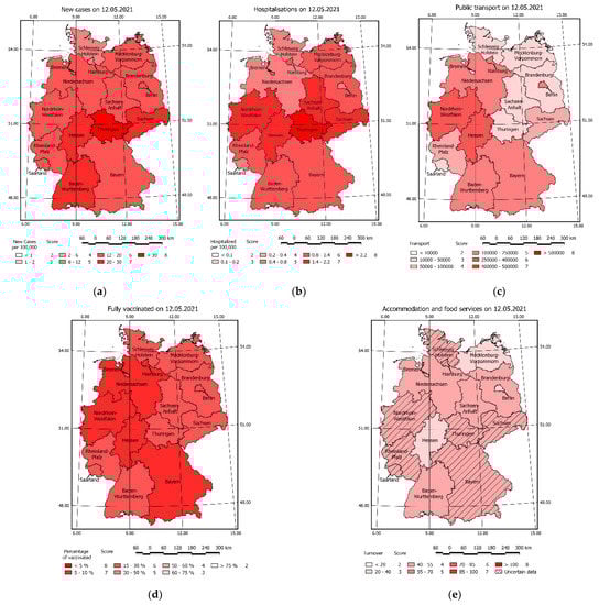 Maps of VSc for selected dynamic criteria on 12 May 2021 (a) new cases (b) hospitalisations (c) public transport (d) fully vaccinated (e) turnover from food and accommodation services.
