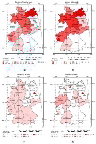 All maps present various VSc. The highest score value of criteria in summary for all regions can be assigned to the numbers of hospitalisations and new cases, the lowest to the railway and road density.