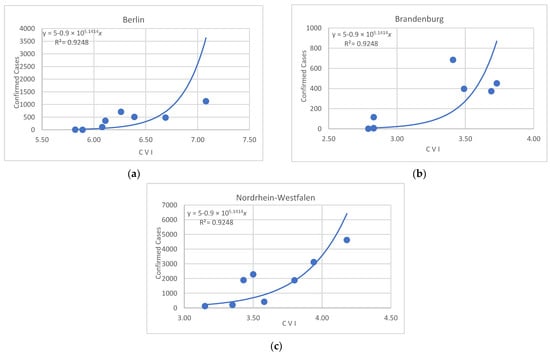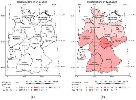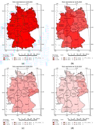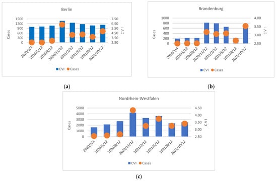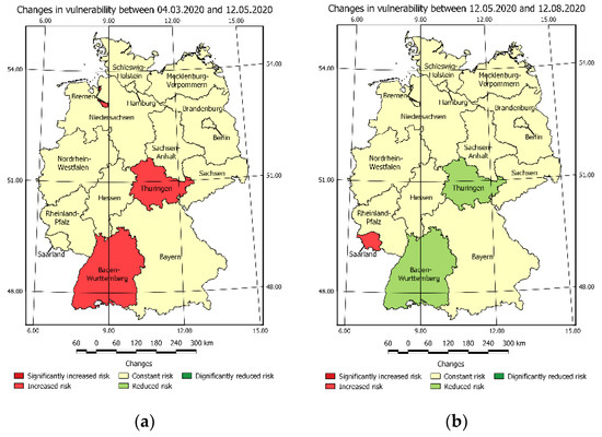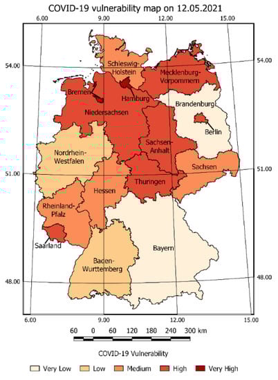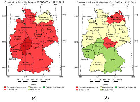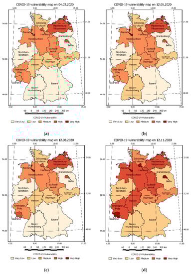 Based on the Vulnerability Score summaries for selected days, the CVI was calculated. Figure 12 presents the sequence of CVI maps in time. Based on Figure 12a it can be noticed that the federal states: Bremen, Saarland, and Hamburg were classified as high or very high vulnerability risk from the very beginning of the pandemic. This suggests that preventive actions like increasing the number of hospitals beds, preparing field hospitals or restrictions should be considered to ensure public safety in those federal states.
