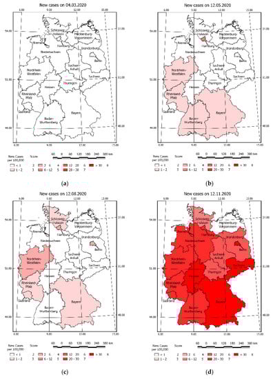 New cases of COVID-19 on selected days: (a) 4 March 2020 (b) 12 May 2020 (c) 12 August 2020 (d) 12 November 2020 remaining maps available in Figure A1.