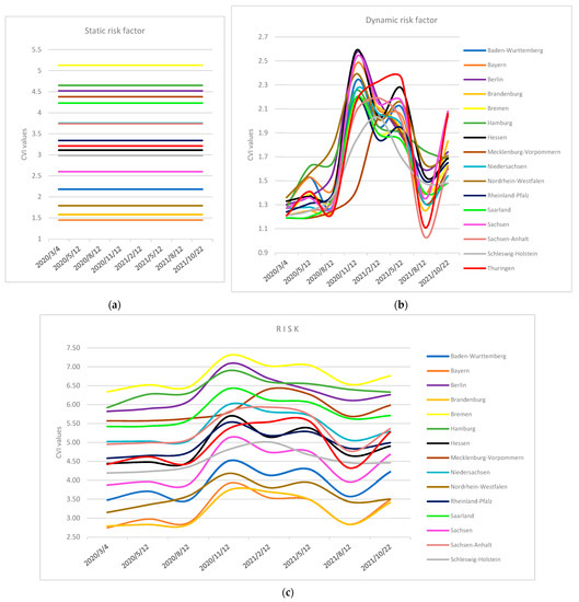 The static (a) dynamic (b) static and (c) summary vulnerability risk for each federal state on selected days.