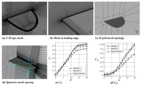 An O-grid mesh topology was applied around the wing planform to capture the detailed flow field near the boundary layer for Model 1 and Model 2 configurations. Therefore, the grid points were concentrated near the wing planform edge, as shown in Figure 2d. For the wind tunnel setting case, a symmetric boundary condition was applied at the wing root plane, as shown in Figure 2c. The no-slip wall boundary condition was enforced on the wing surface. To minimize the farfield boundary condition effects, Model 1 had the domain which is set at 25 upstream, 35 downstream, and the upper and lower boundaries were placed at 25 away from the airfoil leading-edge. However, Model 2 was set as wing tunnel model boundaries which had exactly same dimensions as the real wind tunnel.